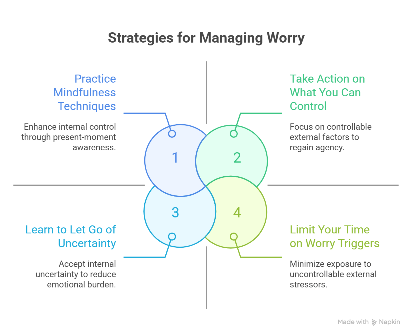 Worry often comes from feeling helpless. The antidote? Action. If you can do something about a situation, create a plan and start tackling it one step at a time. By focusing on what you can control, you regain your sense of agency and replace that helpless feeling with a sense of accomplishment.